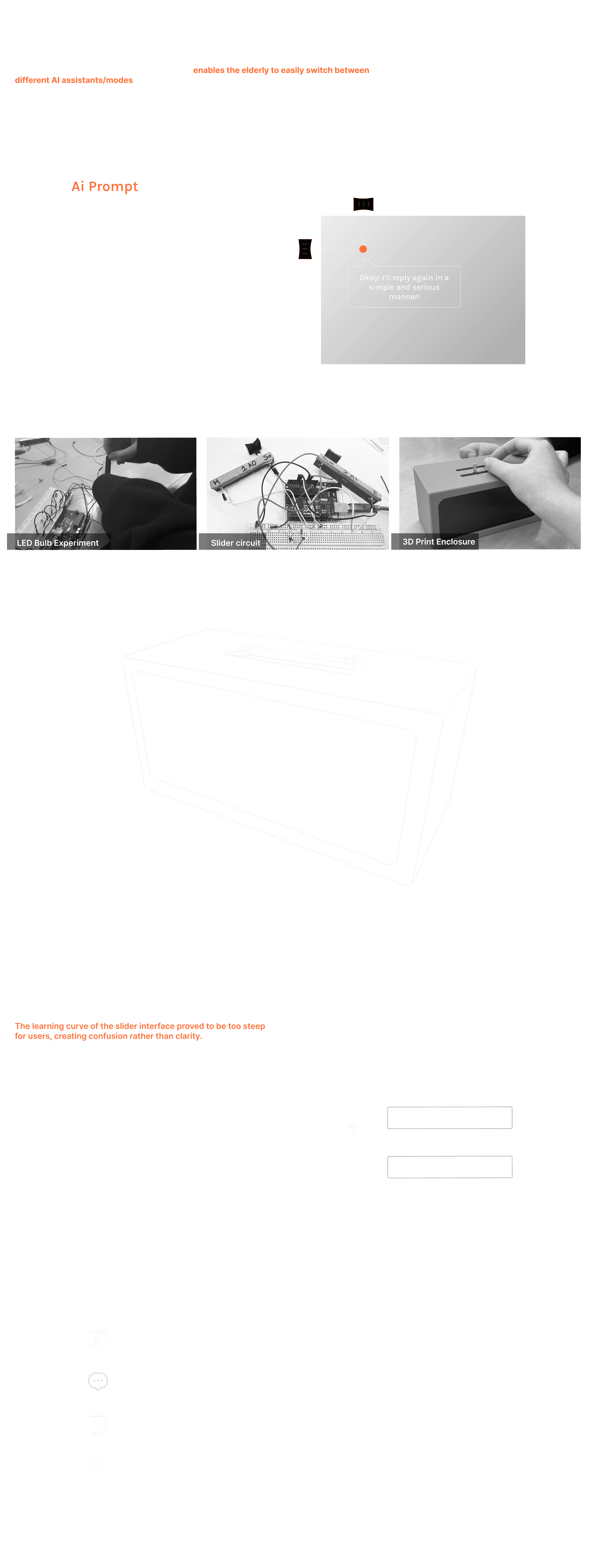 TendeeAI pod significantly reduced the challenges of elders adapting to modern AI systems. The TendeeAi Pod is equipped with only two knobs, designed to simplify the interaction process for elderly users to the greatest extent. The first knob allows seamless switching between five AI personas, enabling users to quickly switch to alternative solutions if unsatisfied with the current response. The second knob scrolls through screen content, allowing users to easily navigate conversations.